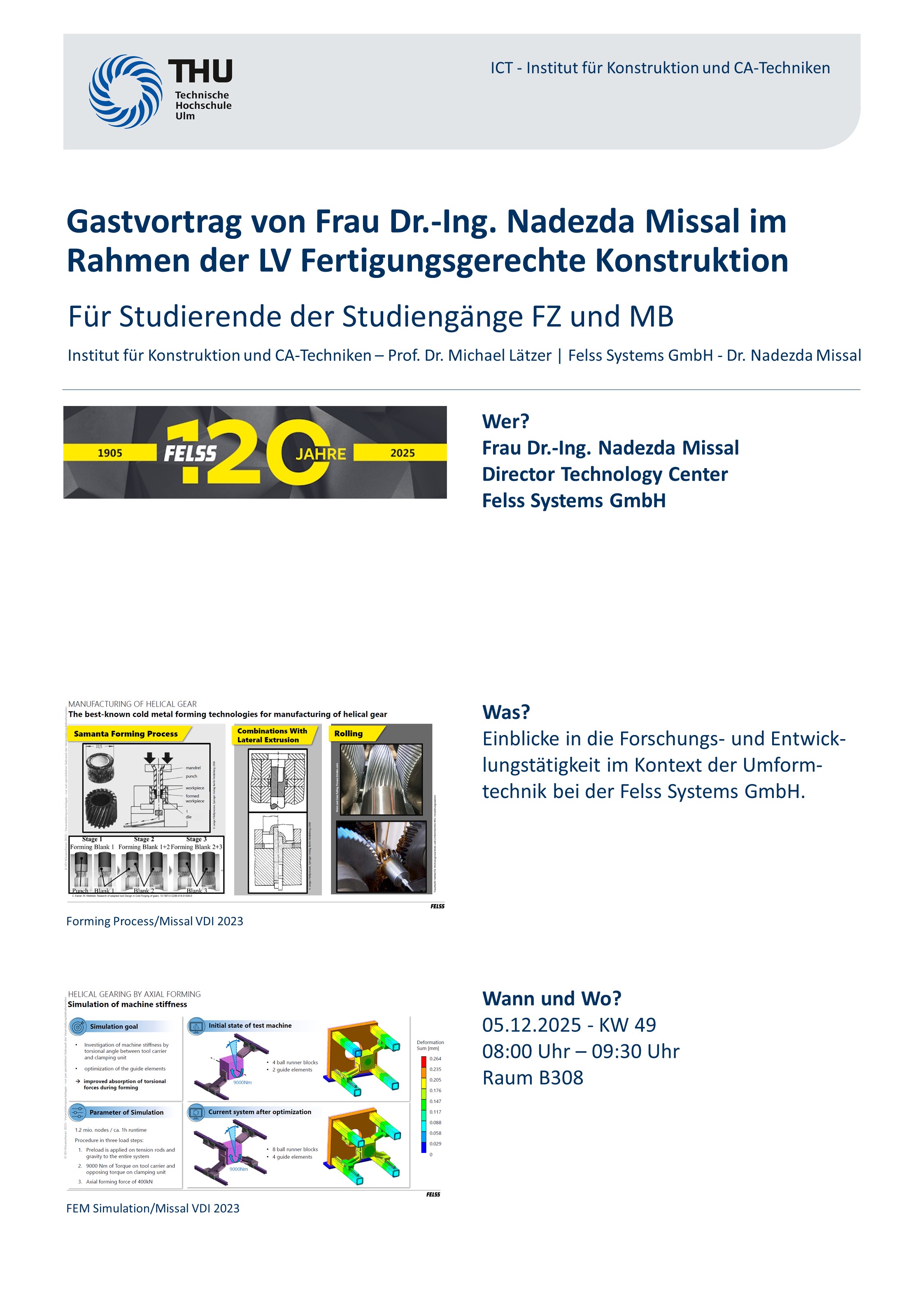 Sie sind auf der Suche nach einer interessanten Abschlussarbeit oder nach einer Stelle als studentische Hilfskraft oder CAD-TutorWir haben immer interessante Aufgaben für Studien-, Bachelor- oder Masterarbeiten in den Bereichen 3D-Druck, Design und Ergonomie, Produktentwicklung​ und Welle-Nabe-Verbindungen. Bitte sprechen Sie gern die Mitarbeitenden u​nd Professor*innen des ICT an. Darüber hinaus kann Kontakt zu Firmen für das Fachpraktikum hergestellt werden.